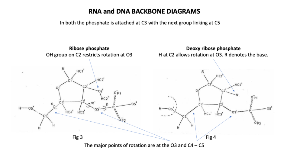 By contrast the ribonucleic backbone of RNA has only 2 stable positions because the extra hydroxyl group on C2 of the sugar restricts the rotation options of the phosphodiester bond (https://sidebysidedna.com/sasisekharan-papers/is-3-nucleotide-rigid/ Sasisekharan Papers 8 p 188).