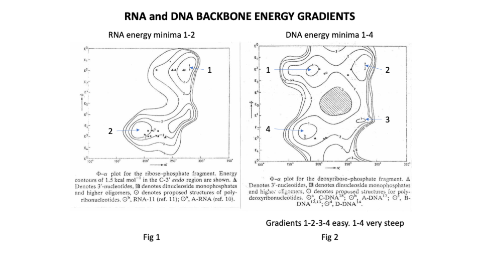 They showed that the deoxy ribonucleic ‘backbone’ of DNA has 4 low energy or stable positions with relatively low energy pathways between them on 3 sides. In effect the molecule can twist from position 1 to 2 to 3 to 4 and back again but it cannot go from 1 to 4 ie it can’t twist full circle, a bit like a human backbone.