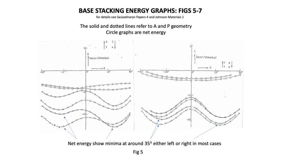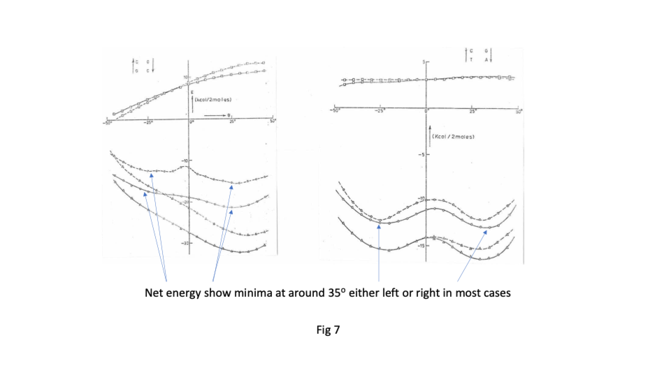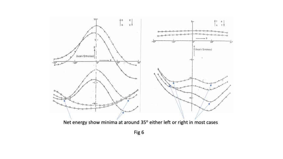 The departure for Sasi was that the lowest energy base stacking could be 35o for right or left-handed in most cases and that there are viable energy gradients between the two stacks again in most cases. Their two papers in Nucleic Acids Research ( https://sidebysidedna.com/sasisekharan-papers/ Sasisekharan Papers 3 and 4) shows these sequence specific stacking energy profiles.